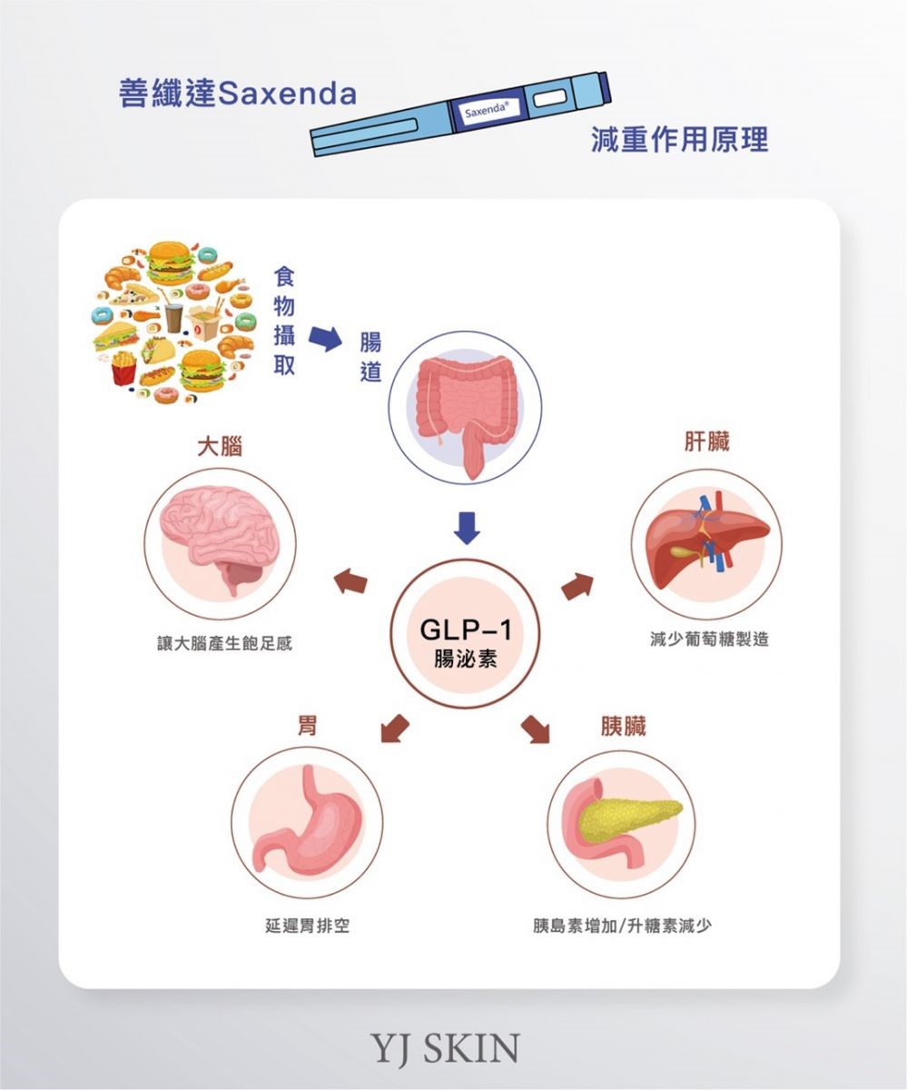 Saxenda善纖達減重筆中的主要成分是Liraglutide(利拉魯肽),主要作用原理是一種『腸泌素GLP-1』類似物,抑制食慾、減緩胃部排空的速度,讓人產生飽足感,減少飢餓,降低進食量,進而幫助降低體重,減少內臟脂肪。適合用來控制肥胖症及慢性體重管理。 另外臨床療效及安全性也顯示其對預防糖尿病、腦中風、心肌梗塞的發病率有所幫助。很多人也會有疑問,既然Liraglutide(利拉魯肽)和人體的腸泌素GLP-1很相似,那這兩者對人體會產生什麼效果呢? 醫師認為,人體進食後,腸道會分泌這種激素,分別對人體的大腦下視丘、胰臟、胃部產生作用,進而達到以下的效果: *腸泌素GLP-1+大腦下視丘➔大腦產生飽足感 *腸泌素GLP-1+胃部➔延遲胃部排空 *腸泌素GLP-1+胰臟➔胰島素分泌增加/升糖素分泌減少 *腸泌素GLP-1+肝臟➔減少製造葡萄糖 關於腸泌素GLP-1減肥,能透過藥物讓人產生飽足感,抑制食欲,讓人在吃飯時,減少進食的份量,達到減肥的效果,也對許多吞(減肥)藥丸有困難的人來說,Saxenda善纖達這類的腸泌素減肥針提供另一種減重方式。