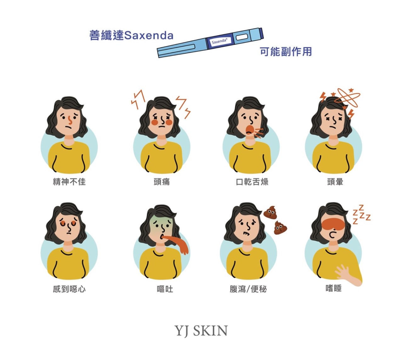 關於Saxenda善纖達減重筆適合族群,醫師有幾個小撇步可以讓大家可以檢視: 1.工作忙碌,沒時間規劃飲食及健身計畫、懶得運動的人 2.食量大、嘴饞愛吃零食者 3.產後肥胖、中年發福、代謝明顯下降者 4.有體重相關共病者,患有三高或代謝症候群者 5.怕吃口服減肥藥、有吞嚥困難者 6.嘗試過其他體重控制方法屢次失敗者 7.抽脂術後或其他消脂療程後,想加強效果者 65%的使用者,暫時性的副作用常見為噁心、嘔吐、腹瀉、便秘,腸胃道不適為最常見的不良反應,少數的人會有頭暈、頭痛、精神不振、口乾、消化不良、胃炎、胃食道逆流、上腹痛….等問題。以上症狀通常會在療程初期出現,通常過一陣子會逐漸減緩,醫生建議如果症狀太嚴重還是盡快就醫,讓專業醫師評估並進行緊急應對。至於其他噁心、嘔吐等副作用可以避免油炸、味道強烈、辛辣、高纖食物等,盡量不要抽菸或喝酒,多喝水,促進腸胃蠕動,預防便祕,吃飯時可以吃慢一點、並減少進食份量,盡量避免讓自己不舒服的氣味或食物,都有助於減緩噁心的症狀。