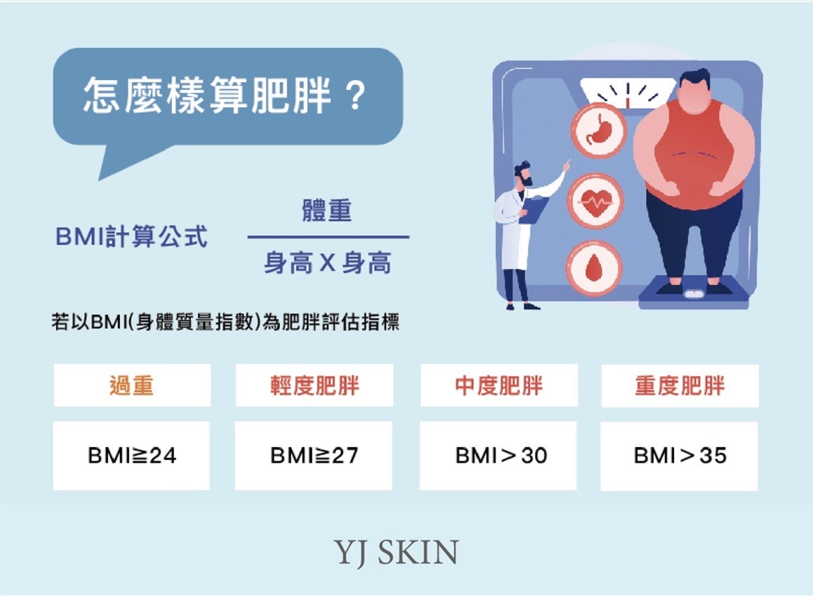 世界衛生組織建議以身體質量指數(Body Mass Index, BMI)來衡量肥胖程度,其計算公式是以體重(公斤)除以身高(公尺)的平方。國民健康署建議我國成人BMI應維持在18.5(kg/㎡)及24(kg/㎡)之間,太瘦、過重或太胖皆有礙健康。