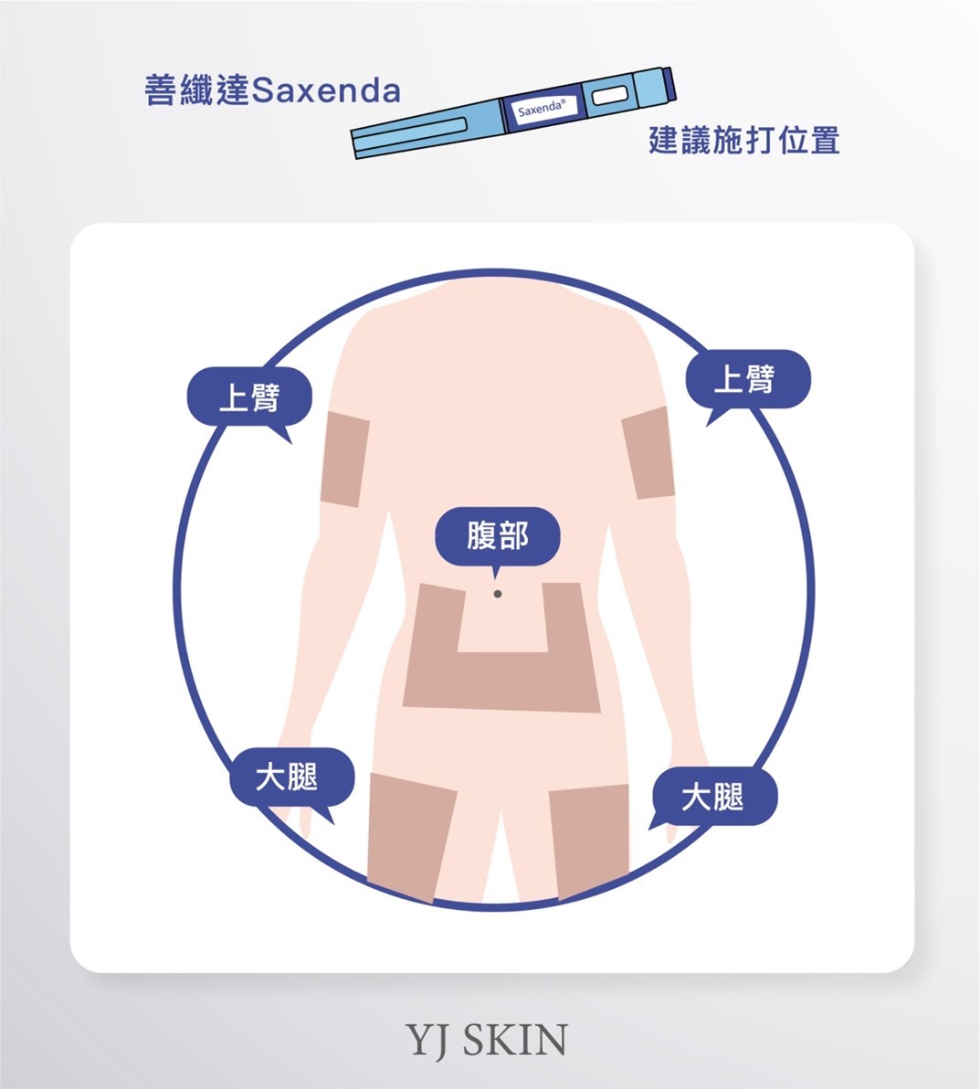 醫師小撇步 *最佳注射部位為腹部(與肚臍保持5cm的距離)、上臂(外側中段)、大腿(前外側上1/3 處)的皮下,容易操作且安全。初次使用Saxenda善纖達的人,建議可以選擇腹部作為施打部位,操作上盡量避開肚臍,選擇肚臍外5公分的位置,才不會打到神經血管較密集的區域,由於腹部施打面積較大,吸收速度會比較快,使用者可以等到熟悉施打流程後,再與其他區域做輪替。需要特別注意的部分是每次施打後務必取下Saxenda善纖達針頭,注射筆存放時不可以裝有針頭,並且拆下來的針頭也不可以重複使用,當次用完就要丟棄,以免造成汙染、滲漏甚至傷口感染。 *每天一次的皮下注射,可以選擇腹部(與肚臍保持5cm的距離) ,上臂或大腿前外側,建議以新手使用者可以腹部範圍為優先施打的部位,容易操作且安全。