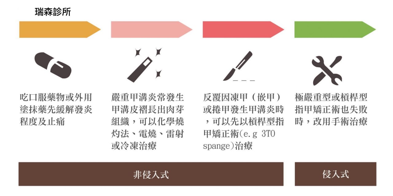 手術治療:針對不同的嵌甲及捲甲有各種不同的手術方法,術式也有很多派別。